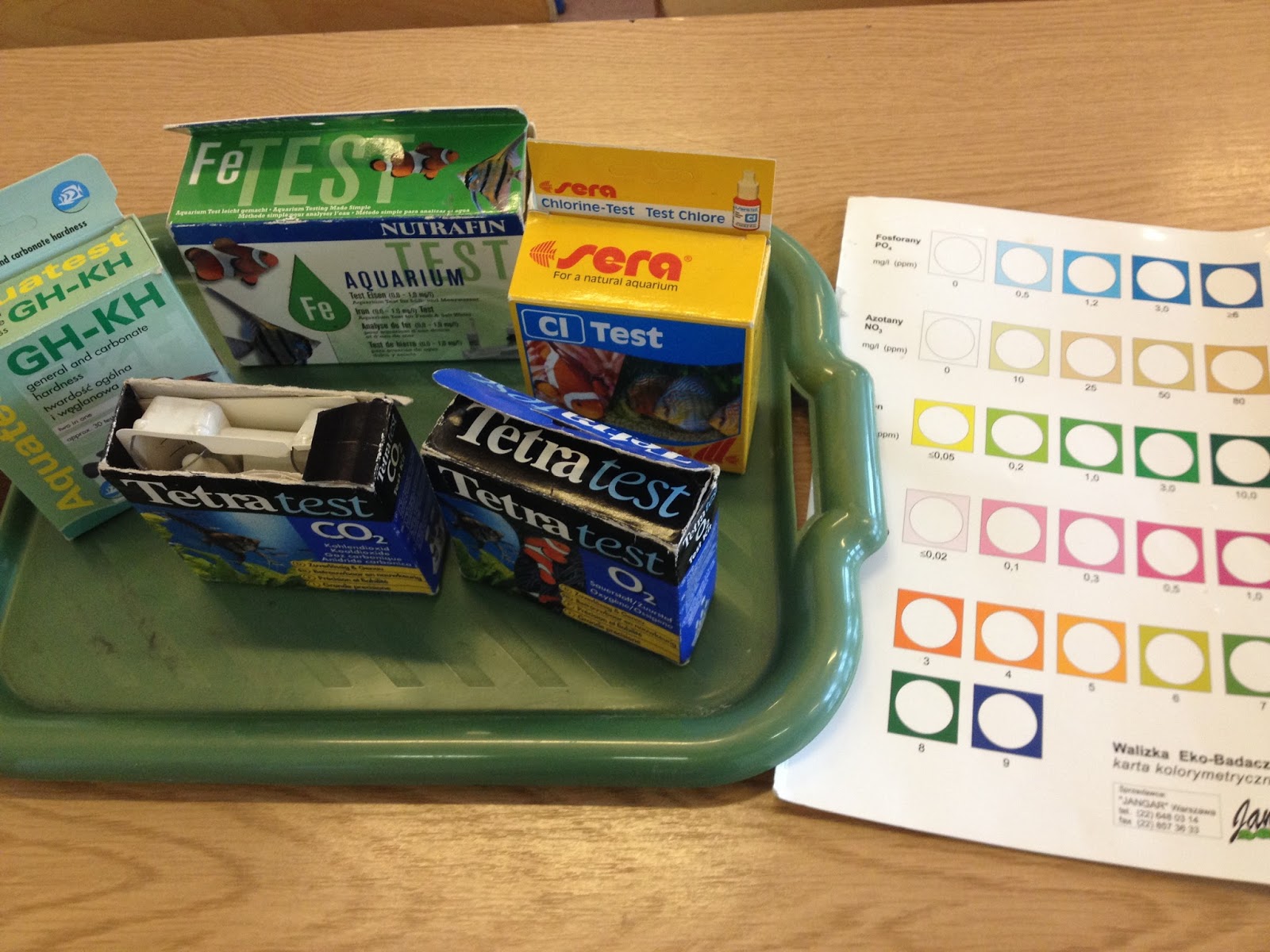 Dzisiaj na zajęciach badaliśmy wodę z akwarium. Wykorzystaliśmy do tego celu testy, dzięki którym określiliśmy ilość tlenu, chloru, żelaza oraz twardość wody.
